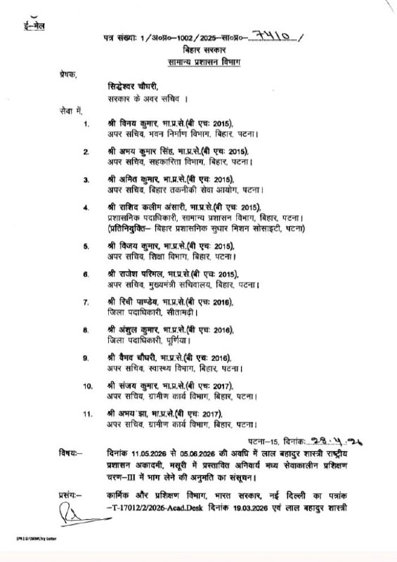 Bihar : बिहार के 11 IAS अधिकारियों को ट्रेनिंग के लिए मसूरी भेजा जा रहा है। इनमें दो जिलों के DM भी शामिल हैं। ये सभी अधिकारी मसूरी स्थित LBSNAA में प्रशिक्षण लेंगे। यह ट्रेनिंग 11 मई से शुरू होकर 5 जून तक चलेगी। ट्रेनिं