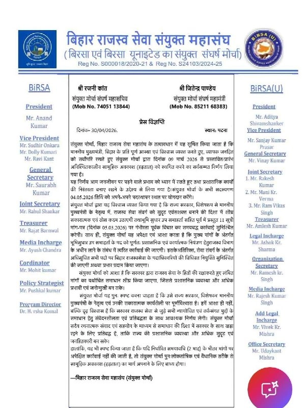 राजस्व एवं भूमि सुधार विभाग के सचिव से बातचीत के बाद यह तय हुआ है कि सभी अंचल और राजस्व अधिकारी 4 मई 2026 से अपने काम पर लौटेंगे।