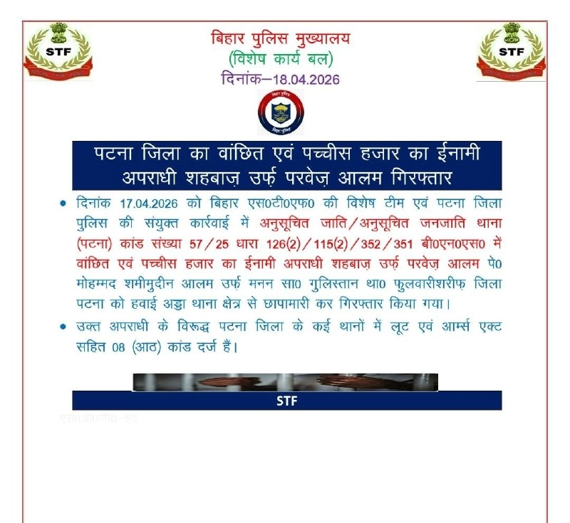Bihar : पटना जिले में पुलिस को एक बड़ी कामयाबी मिली है। बिहार STF ने हवाई अड्डा थाना क्षेत्र से एक वांछित अपराधी को धर दबोचा है। यह अपराधी काफी समय से पुलिस की नजरों से बचा हुआ था और इस पर 25,000 रुपये का इनाम भी घोषित था।