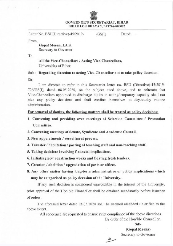 Bihar: राज्य के विश्वविद्यालयों के कामकाज को लेकर राजभवन ने बहुत सख्त निर्देश जारी किए हैं। अब कार्यवाहक कुलपति (Officiating VCs) अपनी मर्जी से कोई भी बड़ा नीतिगत फैसला नहीं ले पाएंगे। राज्यपाल के सचिव गोपाल मीणा ने सभी कुलपतियों को पत्र भेजकर साफ कर दिया है कि कार्यवाहक कुलपति सिर्फ रोजमर्रा के प्रशासनिक काम ही देख सकते हैं।