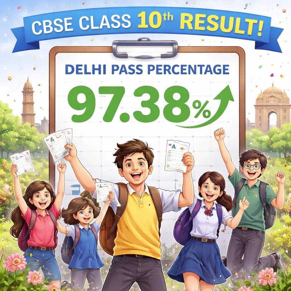 Delhi: केंद्रीय माध्यमिक शिक्षा बोर्ड (CBSE) ने बुधवार, 15 अप्रैल 2026 को कक्षा 10वीं का रिजल्ट घोषित कर दिया है। इस बार दिल्ली के छात्रों ने शानदार प्रदर्शन किया है और शहर का ओवरऑल पास प्रतिशत 97.38% रहा है, जो कि पिछले साल के 95.14% से ज्यादा है। यह रिजल्ट नेशनल एवरेज 93.70% के मुकाबले काफी बेहतर है।