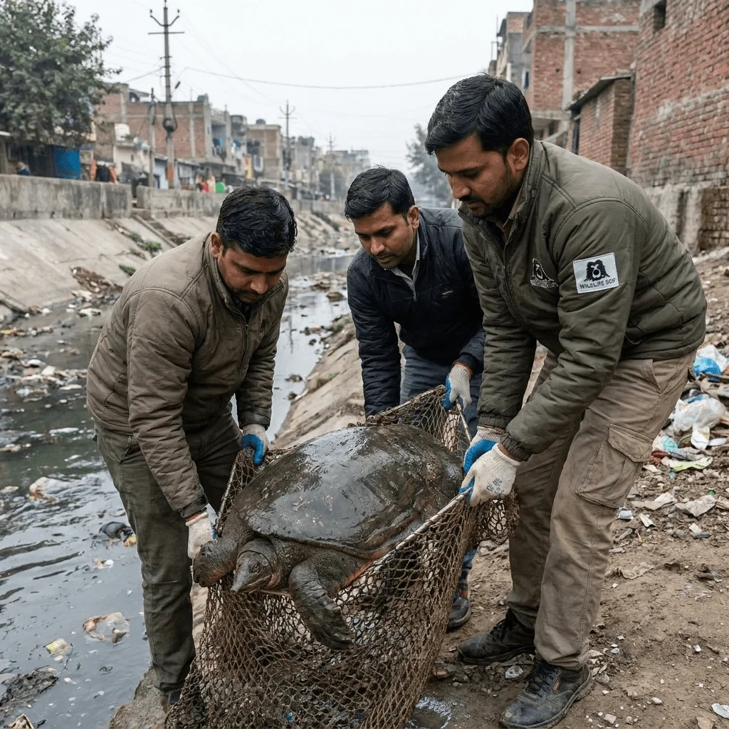 Delhi: पूर्वी दिल्ली के हर्ष विहार, मंडोली इलाके में एक प्रदूषित जल निकाय से 50 किलो वजन का एक दुर्लभ भारतीय फ्लैपशेल कछुआ बचाया गया। स्थानीय परिवार ने इस कछुए को मुसीबत में देखा और तुरंत Wildlife SOS को इसकी जानकारी दी। शुक्रवार, 17 अप्रैल 2026 को टीम ने मौके पर पहुंचकर इस संरक्षित जीव को सुरक्षित बाहर निकाला।