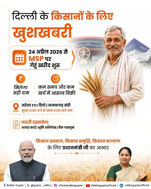 सरकार ने इस खरीद अभियान की घोषणा 21 अप्रैल 2026 को की थी। रबी विपणन सत्र 2026-27 के लिए गेहूं की खरीद 24 अप्रैल 2026 से शुरू होगी। दिल्ली के किसानों को अपनी फसल बेचने के लिए नरेला और नजफगढ़ की मंडियों और FCI डिपो में जाना होगा। इस कदम से लगभग 21,000 किसानों को सीधा लाभ मिलने की उम्मीद है।