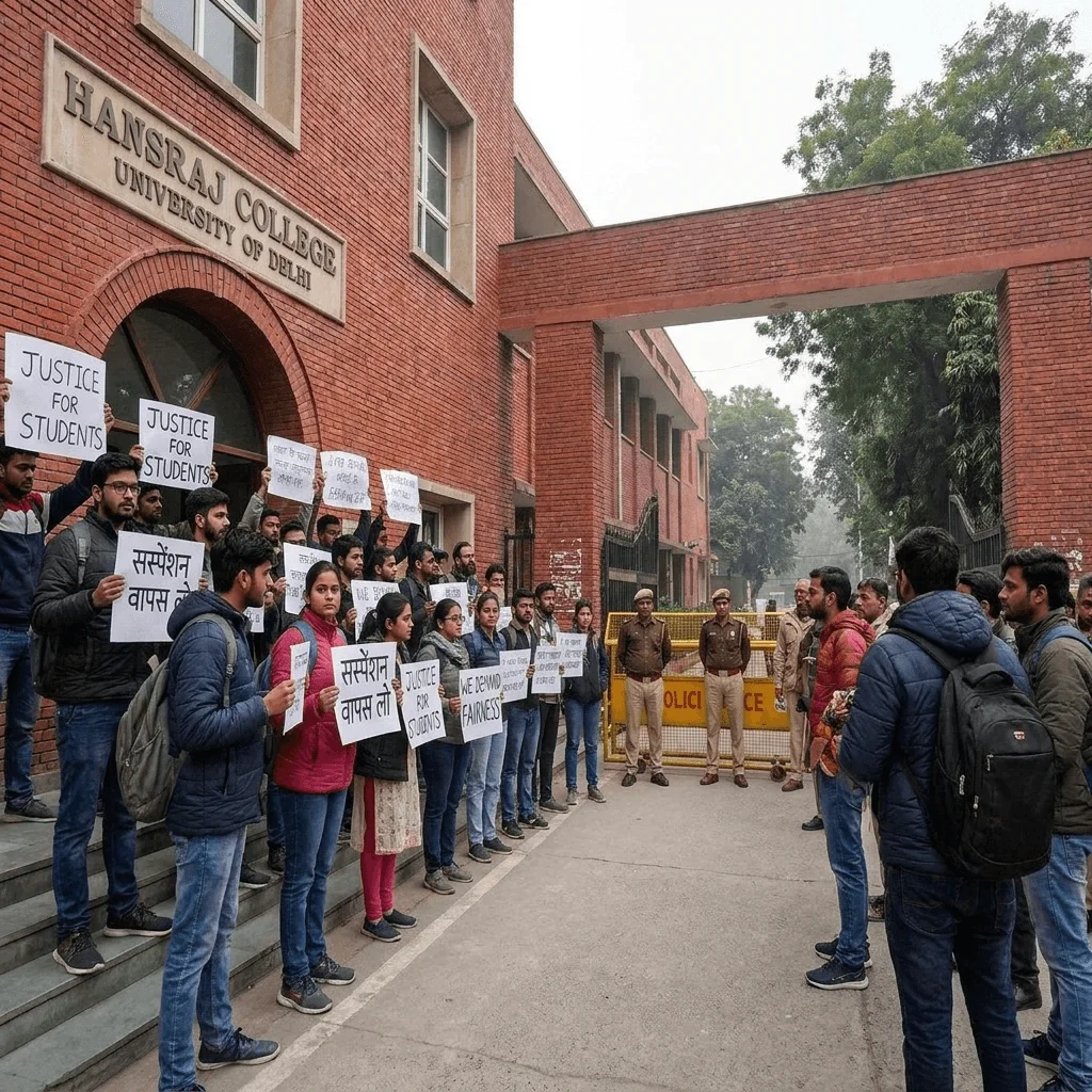 Delhi: दिल्ली यूनिवर्सिटी के Hansraj College में तनाव का माहौल है। कॉलेज प्रशासन ने करीब 30 छात्रों को सस्पेंड कर दिया है, जिनमें स्टूडेंट यूनियन के चार पदाधिकारी भी शामिल हैं। इस कार्रवाई के बाद कैंपस में छात्रों का गुस