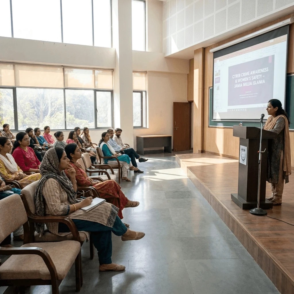 Delhi: दिल्ली पुलिस पब्लिक लाइब्रेरी ने Jamia Millia Islamia में साइबर सुरक्षा और महिलाओं की सुरक्षा को लेकर एक खास जागरूकता सेशन आयोजित किया। यह प्रोग्राम शिखर ऑर्गनाइजेशन फॉर सोशल डेवलपमेंट, जेएंडके गर्ल्स हॉस्टल के प्रोवोस्ट ऑफिस और दिल्ली पुलिस के सहयोग से पूरा हुआ। इस सेशन का मुख्य मकसद छात्राओं को ऑनलाइन और ऑफलाइन खतरों से बचाने के लिए जागरूक करना था।