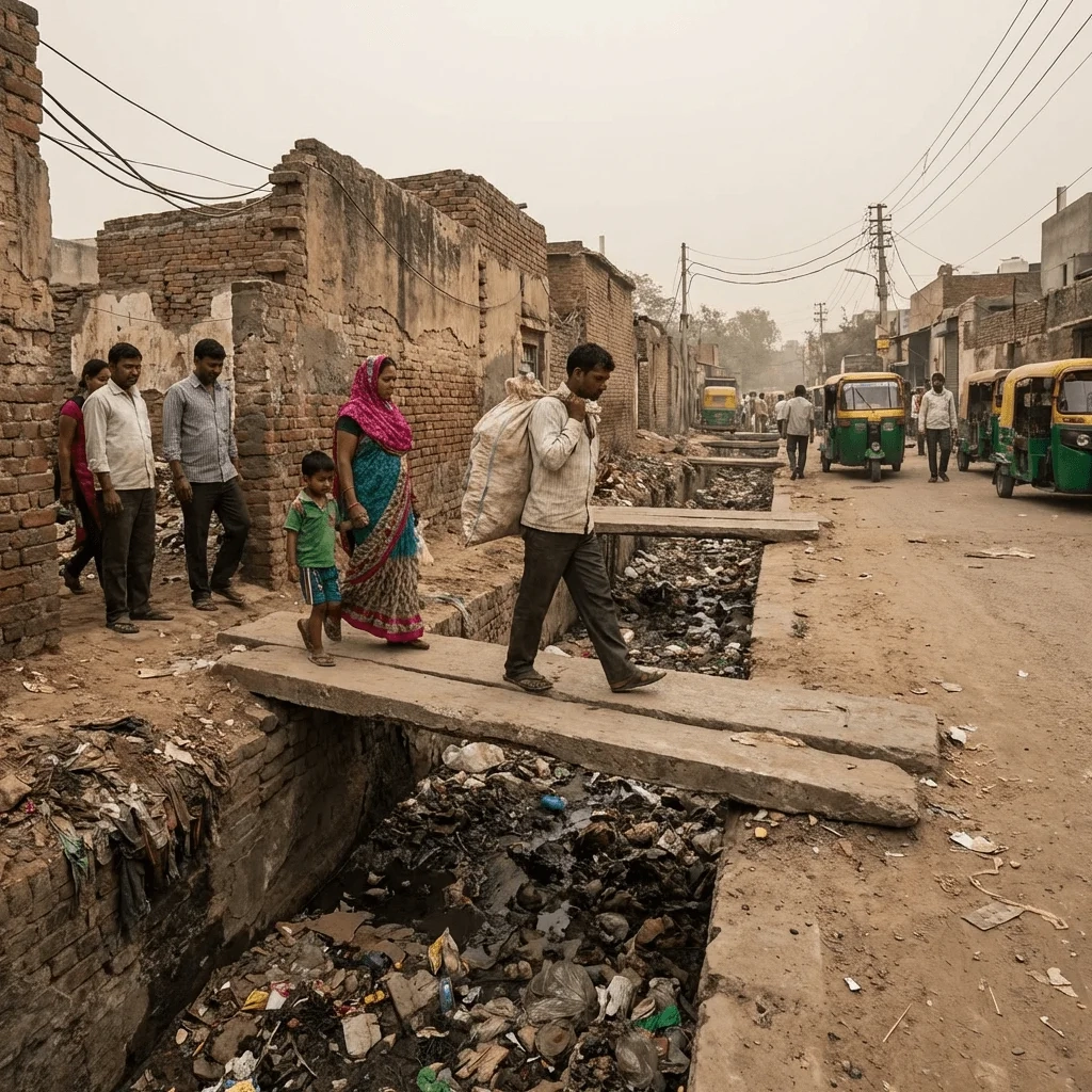 Delhi: ओखला फेज-1 के इंदिरा कैंप इलाके में रहने वाले सैकड़ों लोग एक बेहद खतरनाक जुगाड़ वाले पुल का इस्तेमाल करने को मजबूर हैं। गंदे पानी के नाले के ऊपर सीमेंट के दो पतले स्लैब रखे गए हैं, जिन्हें लोग शॉर्टकट ब्रिज की तरह इस्तेमाल करते हैं। सालों से चल रहे इस खतरे की वजह से कई लोग चोटिल हो चुके हैं और एक व्यक्ति की जान भी जा चुकी है।