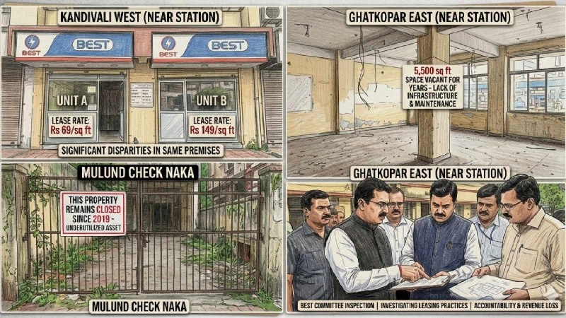 जांच के दौरान मुलुंड और घाटकोपर ईस्ट में कई संपत्तियां खाली मिलीं। घाटकोपर ईस्ट में करीब 5,500 स्क्वायर फीट की एक कमर्शियल प्रॉपर्टी सालों से बिना इस्तेमाल के पड़ी है। वहीं मुलुंड चेक नाका के पास 6,400 स्क्वायर फीट का एक प्लॉट 2019 से बंद है। इससे BEST को मिलने वाली कमाई का सीधा नुकसान हो रहा है।
