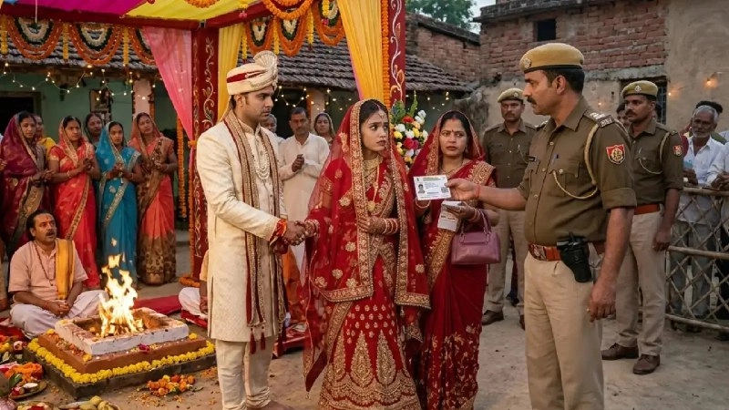 Bihar: रोहतास जिले के सासाराम से एक हैरान करने वाला मामला सामने आया है। यहाँ एक शादी समारोह के दौरान जब दूल्हा और दुल्हन फेरे ले रहे थे, तभी पुलिस ने मंडप में एंट्री की। पुलिस ने दुल्हन से उसका आधार कार्ड मांगा और जैसे ह