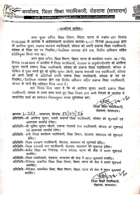 Bihar: रोहतास जिले के शिक्षा विभाग ने एक बड़ा कदम उठाते हुए विवादित प्रभारी BEO अरविंद कुमार को उनके पद से हटा दिया है। यह आदेश तत्काल प्रभाव से लागू कर दिया गया है। विभाग ने अब इस पद का अतिरिक्त प्रभार सुमित कुमार चौधरी