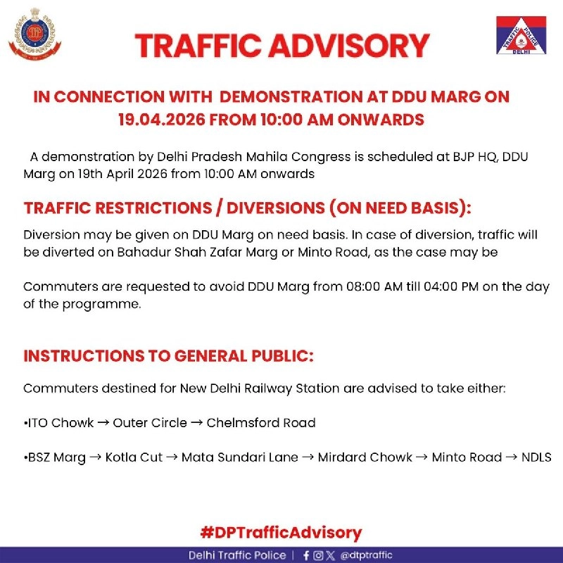 Delhi: दिल्ली के डीडीयू मार्ग (DDU Marg) पर 19 अप्रैल 2026 को ट्रैफिक व्यवस्था में बदलाव किया जाएगा। दिल्ली प्रदेश महिला कांग्रेस द्वारा भाजपा मुख्यालय (BJP HQ) के बाहर प्रदर्शन किया जाना है, जिसकी वजह से सड़क पर वाहनों