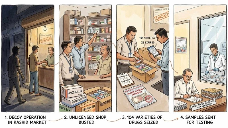 Delhi: शाहदरा के खुरेजी गांव स्थित राशिद मार्केट में ड्रग कंट्रोल डिपार्टमेंट ने एक अवैध फार्मेसी का भंडाफोड़ किया है। यह दुकान बिना किसी वैध लाइसेंस के लोगों को दवाइयां बेच रही थी। विभाग ने एक फर्जी ग्राहक भेजकर इसकी पुष्टि की, जिसके बाद 20 अप्रैल 2026 को यहां छापेमारी की गई।