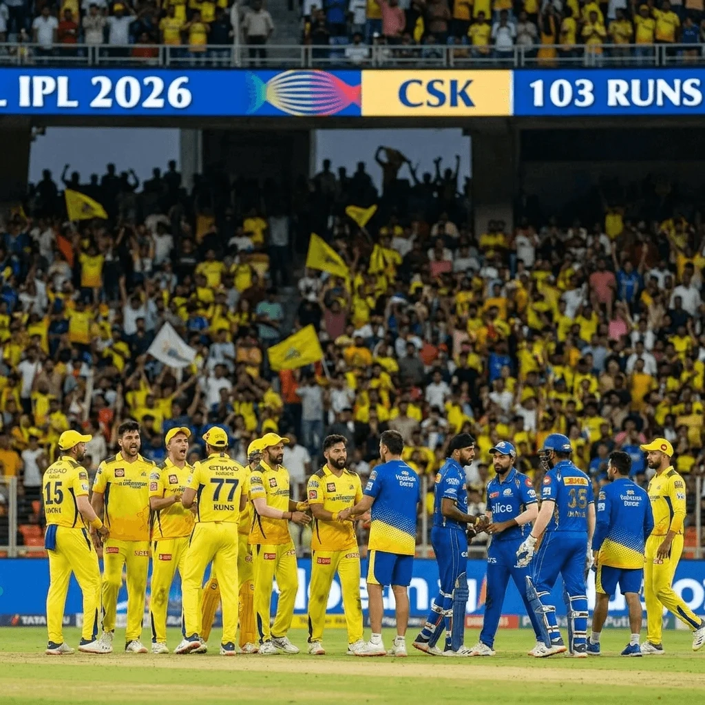 CSK ने पहले बल्लेबाजी करते हुए 207/6 का बड़ा स्कोर खड़ा किया। टीम की तरफ से Sanju Samson ने शानदार बल्लेबाजी की और 54 गेंदों में नाबाद 101 रन बनाए। जवाब में मुंबई इंडियंस की टीम पूरी तरह बिखर गई और 19 ओवर में सिर्फ 104 रन बनाकर ऑल आउट हो गई। चेन्नई के लिए Akeal Hosein सबसे सफल गेंदबाज रहे जिन्होंने 17 रन देकर 4 विकेट चटकाए।