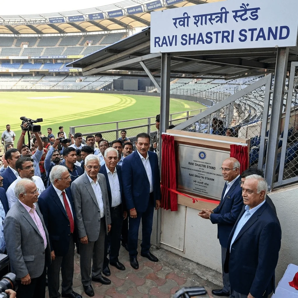 वानखेड़े स्टेडियम के लेवल 1 पर, प्रेस बॉक्स के ठीक नीचे अब ‘Ravi Shastri Stand’ होगा। इस सम्मान की मंजूरी MCA की एपेक्स काउंसिल ने फरवरी में दी थी और इसका आधिकारिक उद्घाटन 9 अप्रैल 2026 को हुआ। इस कार्यक्रम में महाराष्ट्र के मुख्यमंत्री Devendra Fadnavis और MCA अध्यक्ष Ajinkya Naik समेत कई लोग शामिल हुए। इसके अलावा स्टेडियम के कुछ गेटों के नाम भी दिग्गज खिलाड़ियों के नाम पर रखे गए हैं।